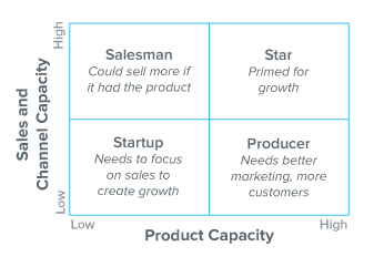 - Lower Left: The Startup. Firms that are constrained in both production and sales may be actual startups, or they may be longtime small businesses that have developed neither channel or product capacity depth over time. For some small businesses this is the owner’s lifestyle choice. More sales, or more product capacity, might lead to more work and growth the owner would really prefer not to take on. But for all others, there is a need to develop both sales and capacity scenarios and strategies.