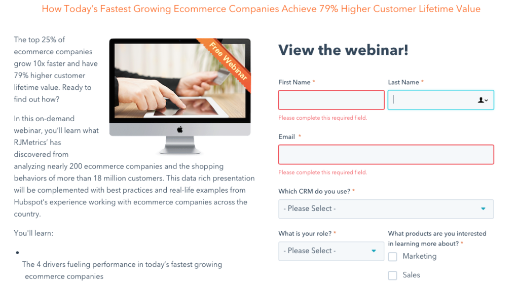 When you visit HubSpot’s free webinar page, you find dozens of webinars available for on-demand viewing. Each webinar has its own landing page with a form and compelling summary of the webinar content.