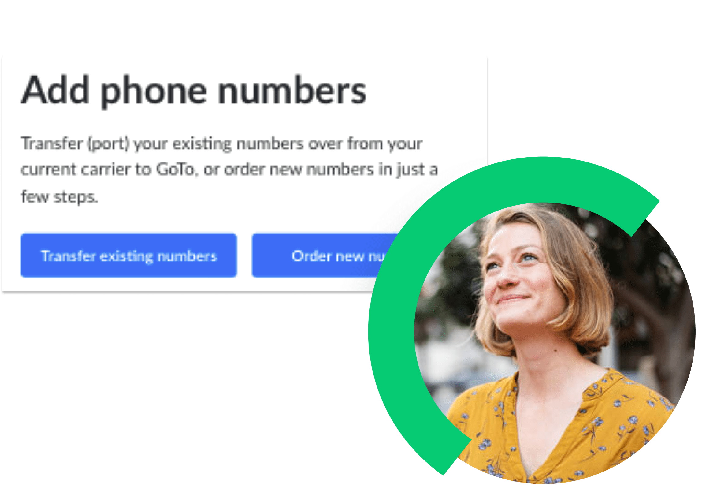 When you move to GoTo Connect, you can transfer your existing business telephone number or vanity number, including area code, from your current provider and bring it to GoTo Connect. Transferring an existing telephone number means you won't have to spend time or money to produce new business collateral like advertising, business cards, and marketing materials to alert your customers and prospects.
