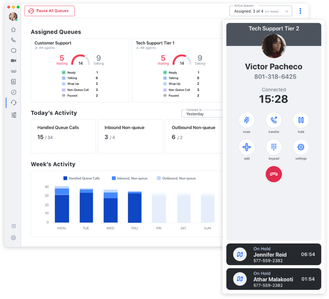 Conecte sua equipe a chamadas em menos tempo com logins com 1 toque e informações de filas em tempo real. Permita que os integrantes da sua equipe pausem as filas sem precisar fazer logout. Veja informações da chamada, como fila de origem, tempo de espera e identificador da chamada.